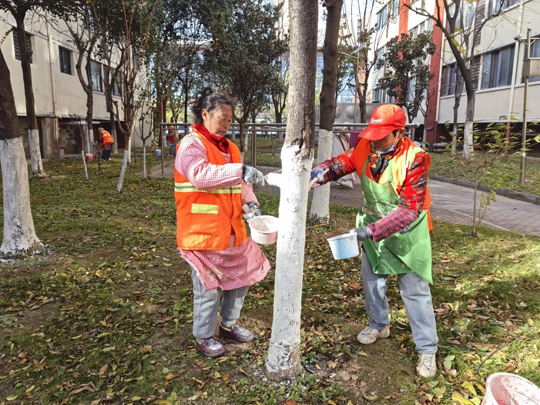 細(xì)心的業(yè)主不難發(fā)現(xiàn),樹木已悄然穿上整齊的“冬裝”。物業(yè)工作人員有條不紊地對喬木根部進(jìn)行涂白處理。這層白色“防護衣”不僅美觀,更是樹木越冬的“守護者”——它能有效反射部分陽光,減緩樹干因晝夜溫差過大而導(dǎo)致的凍裂風(fēng)險,同時清除樹皮縫隙中潛藏的害蟲及蟲卵,為來年春季樹木茁壯成長打下堅實基礎(chǔ)。