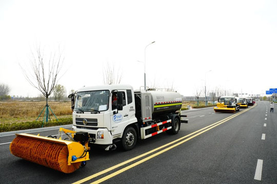 此次演練活動在園區(qū)復旦路和紫金山路現場展開,模擬宿遷地區(qū)寒潮大雪天氣下的道路掃雪除冰應急處置。隨著現場指揮一聲令下,演練正式拉開帷幕。所有人員及各類掃雪除冰設備迅速抵達指定位置,嚴格按照“雪前準備、預警發(fā)布、應急啟動”的流程展開作業(yè)。演練以機械除雪為主,人工清理為輔,多臺撒布機、雪滾車、雪鏟車等專業(yè)設備輪番上陣,在模擬的冰雪場景中高效進行清雪和除冰作業(yè),全面檢驗了應急預案的科學性和實操性。