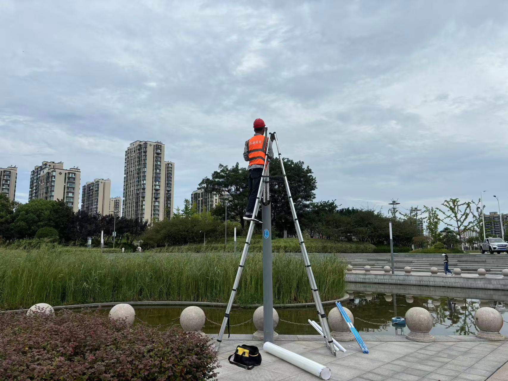 沈剛強(qiáng)介紹:“昨晚巡視發(fā)現(xiàn)蘇州公園大舞臺頂棚部分燈具因高溫?fù)p壞,今天一早我們立即組織維修,確保不影響居民晚上鍛煉。”