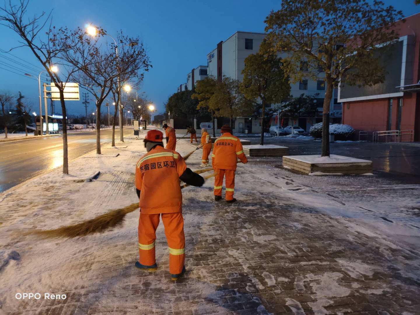 在園區(qū)公舍防疫值守的李佃左說道:“雖說疫情來了,但大家伙的心是牢牢團結在一起的,這不一看下雪了,擔心復工人員上班時的出行安危,大家伙都忙活起來啦!”當晚,建發(fā)公司員工、園區(qū)環(huán)衛(wèi)人員“相約”在轄區(qū)內及園區(qū)道路街頭,在嚴寒中默默堅守,與冰雪爭分奪秒,你鏟我掃、撒布融雪劑,井然有序,從容不亂,大家齊心協(xié)力、配合默契,為保障轄區(qū)內通暢竭盡全力。在掃雪除冰的同時,園區(qū)公舍集宿區(qū)工作人員仍然堅守在執(zhí)勤點執(zhí)勤防控,有序做好各項疫情防控工作。